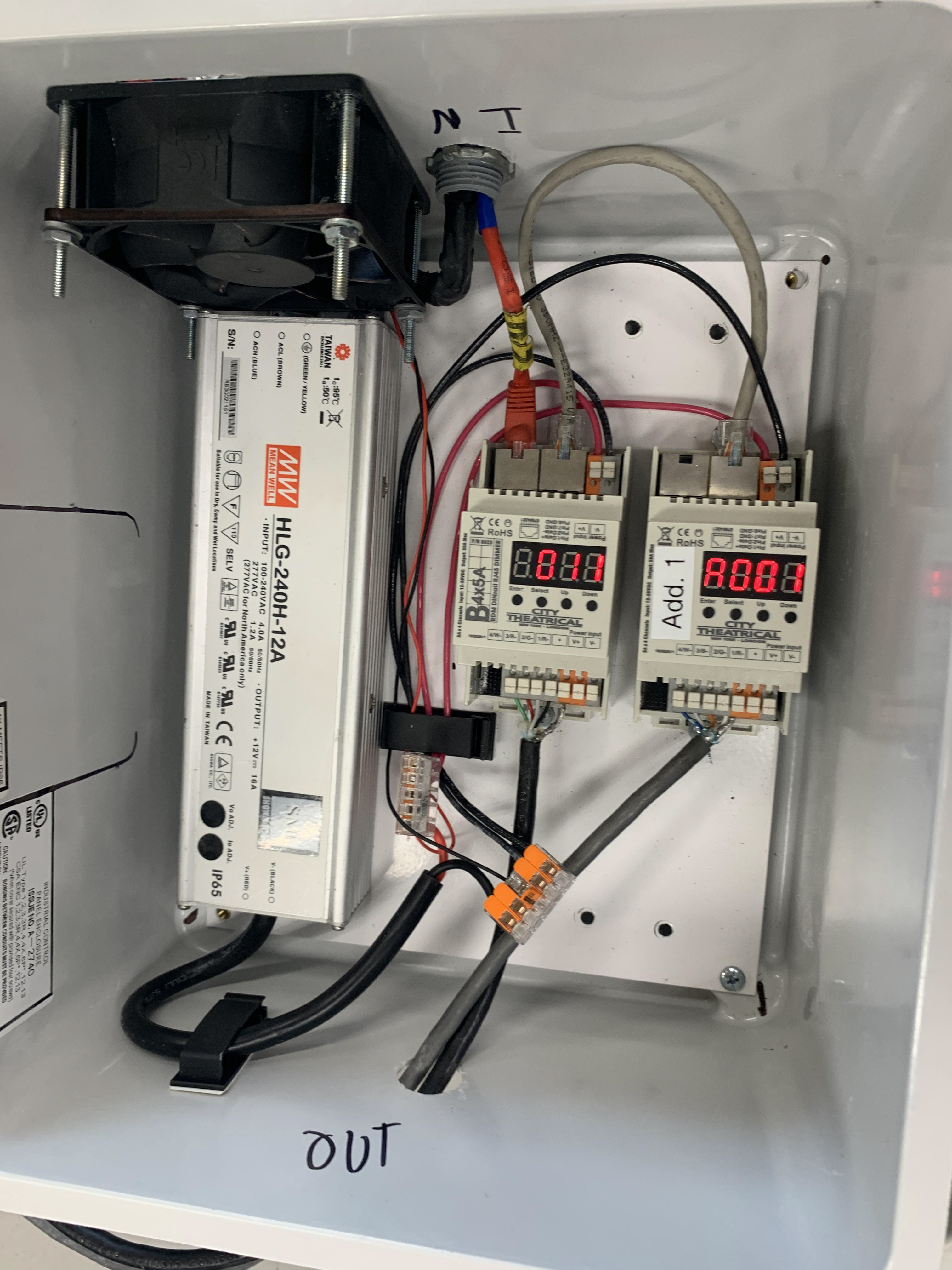 Design and implementation of a reusable all in one LED power and control box. This set-up can be used not only with the LED tape footlights built for Fall Dance 2019, but with a variety of LED Tape set-ups. With two DMX decoders this set-up provides the user with two DMX controllable 4ch, 5v outputs for LED tape.