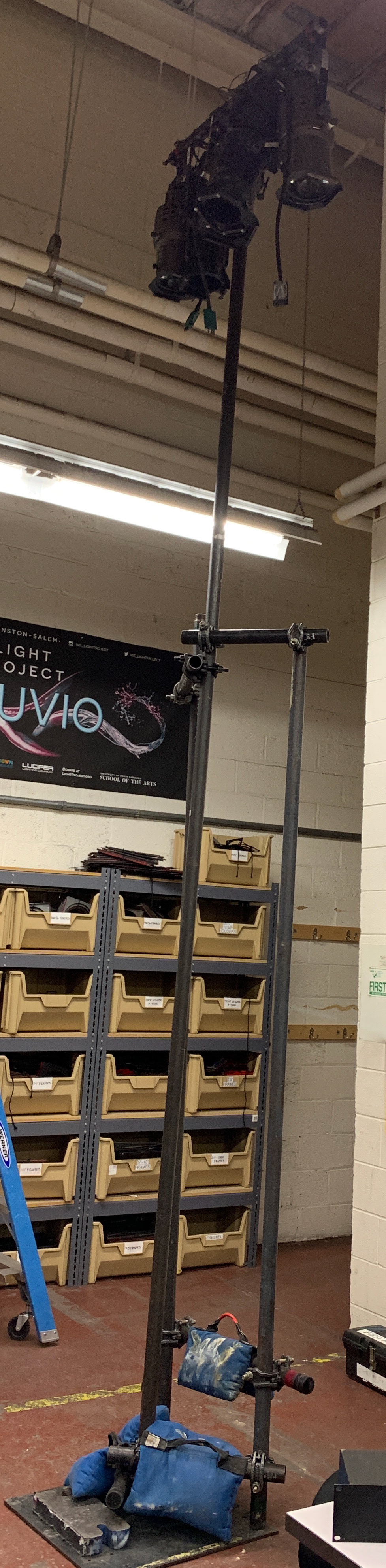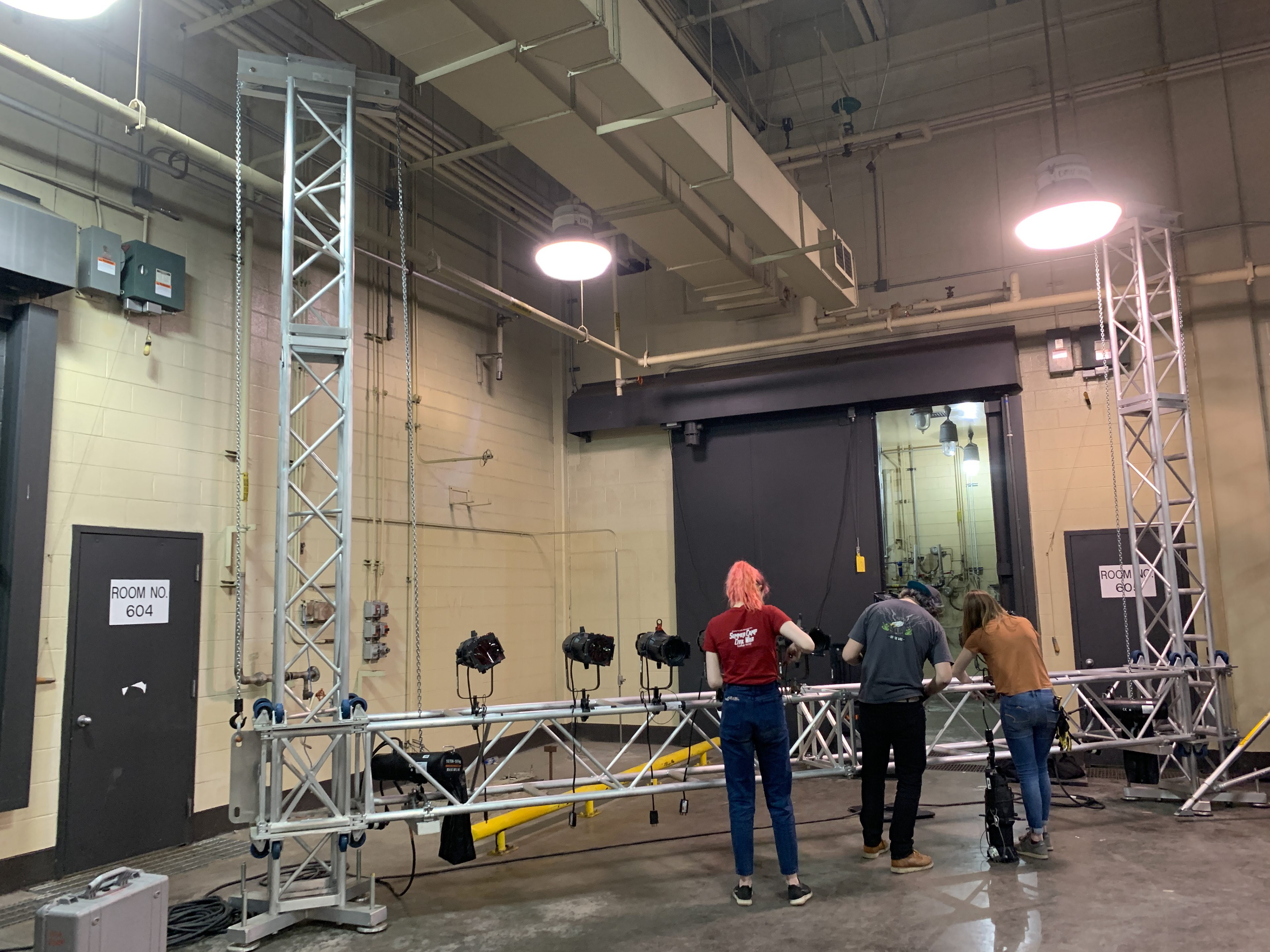 The warehouse owners did not allow us to rig from the buildings structure. This meant that all positions must be ground supported. I worked with the school of Filmmaking to borrow the truss tower system shown in the picture to the right. This, along with our other ground supported truss structures, created many of our positions for the main acting space.